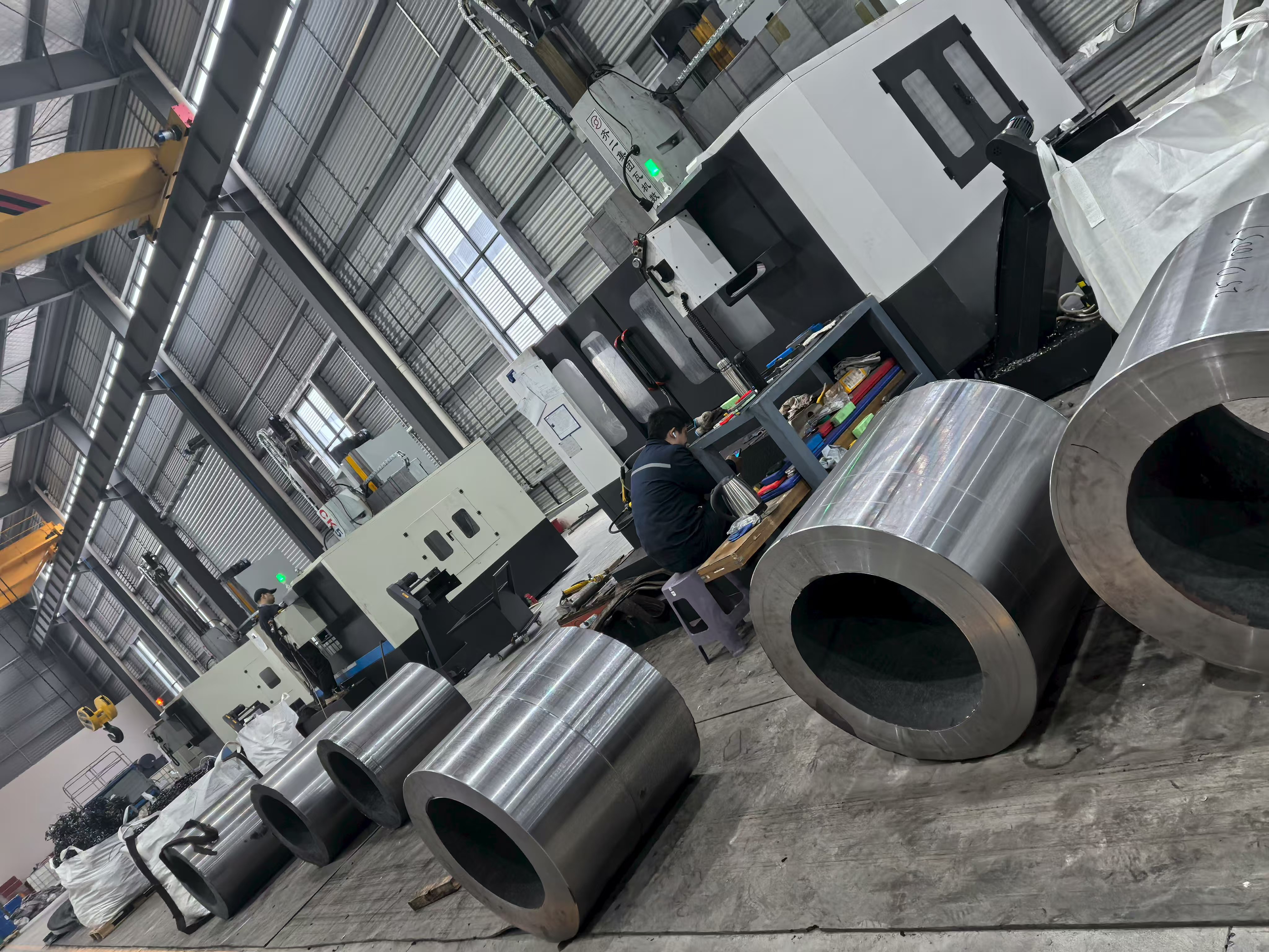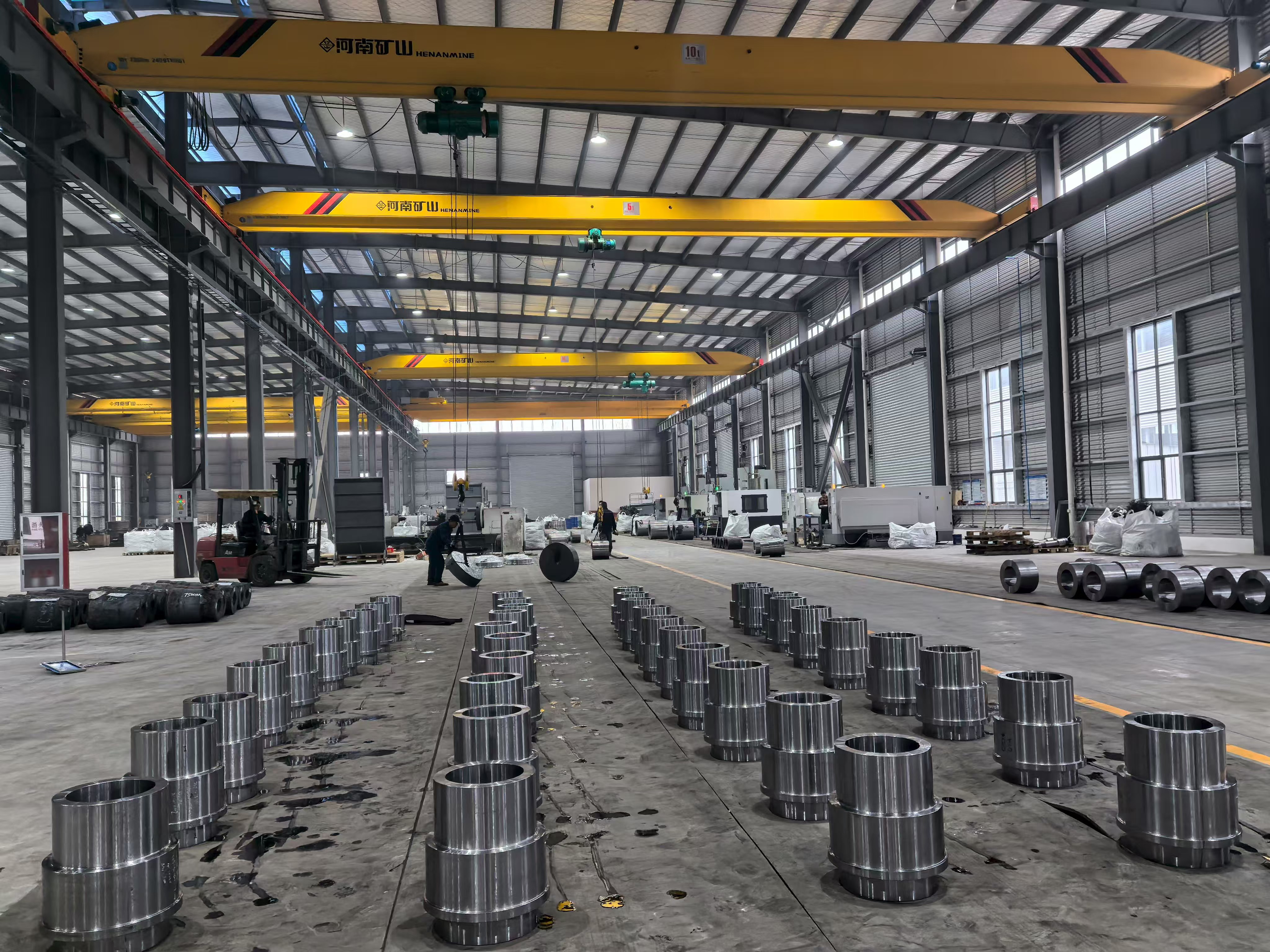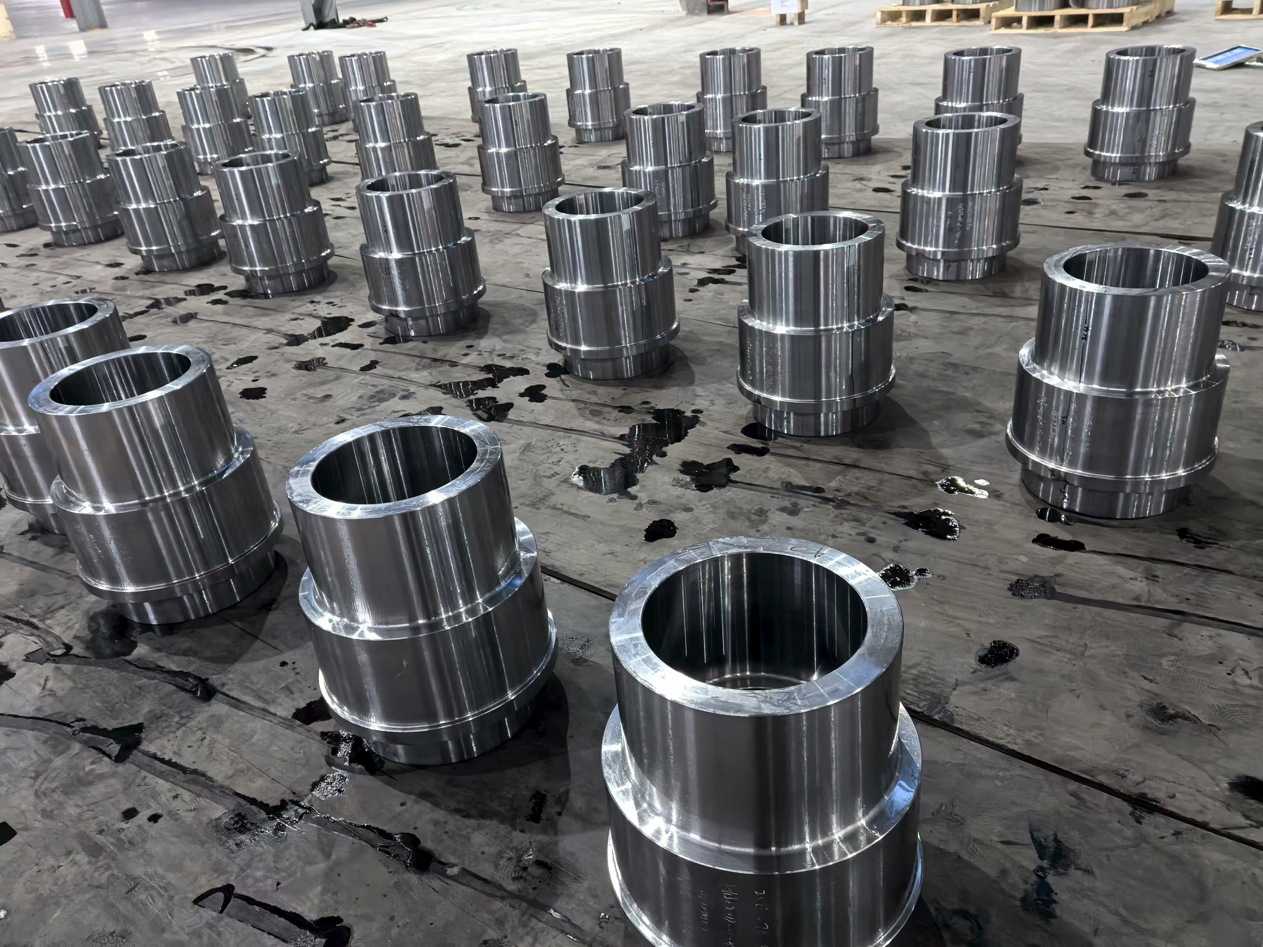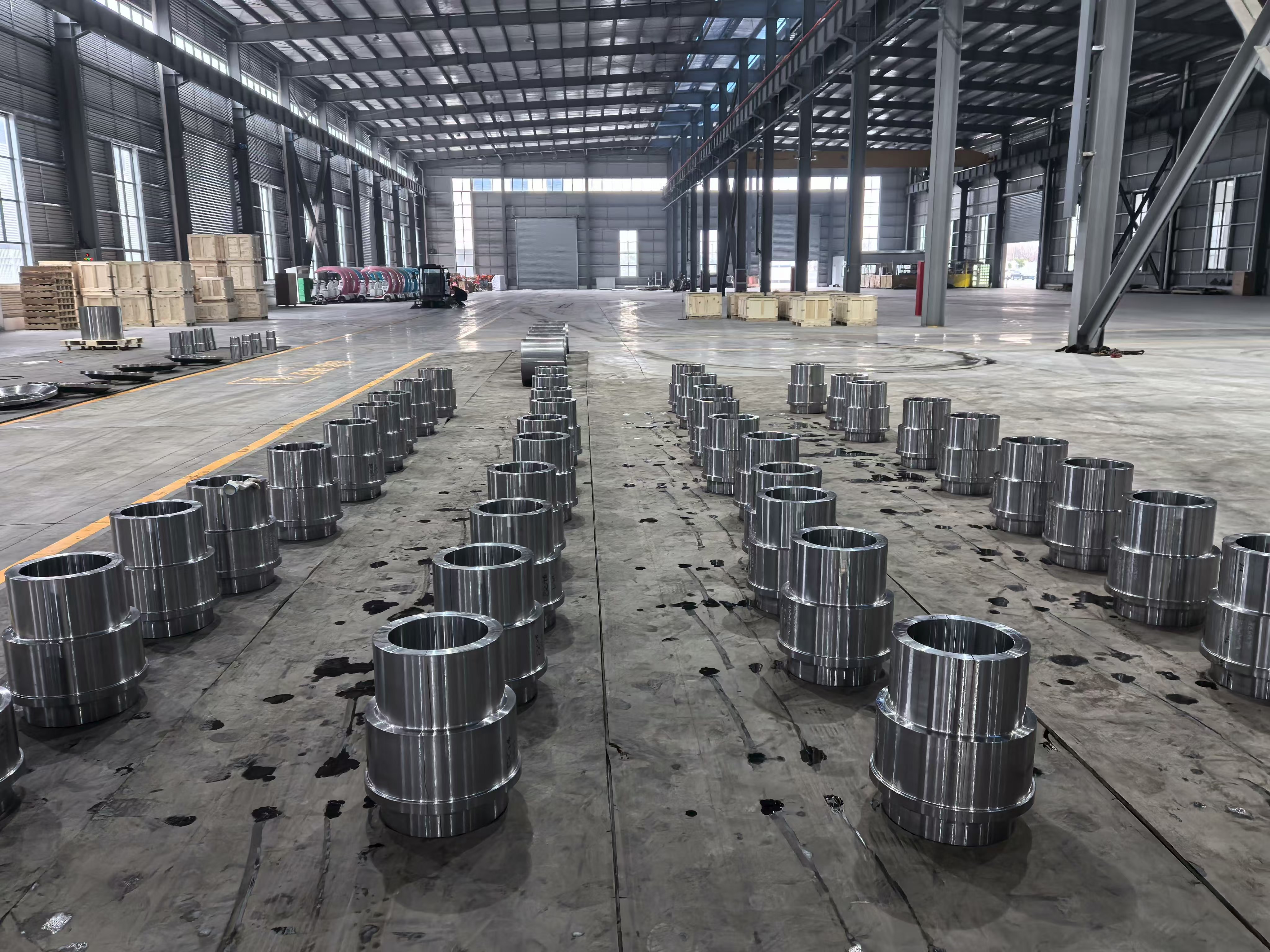 생산 기지의 시설 이미지에는 정밀 가공된 강철 링과 허브 구성 요소가 작업장 바닥 전체에 체계적인 배치 배열로 배치되어 있는 모습이 나와 있습니다. 이는 그룹의 대량 생산 능력을 시각적으로 입증하는 것입니다. 각 구성 요소는 단일 통합 생산 시스템 내에서 단조, 열처리 및 CNC 가공을 결합한 결과 일관된 표면 마감, 치수 균일성 및 엄격한 공차를 나타냅니다. 가공 작업장에는 대구경 원통형 슬리브부터 복잡한 플랜지 허브 어셈블리에 이르기까지 다양한 공작물을 사용하여 동시에 작동하는 여러 개의 CNC 터닝 및 머시닝 센터가 있습니다.