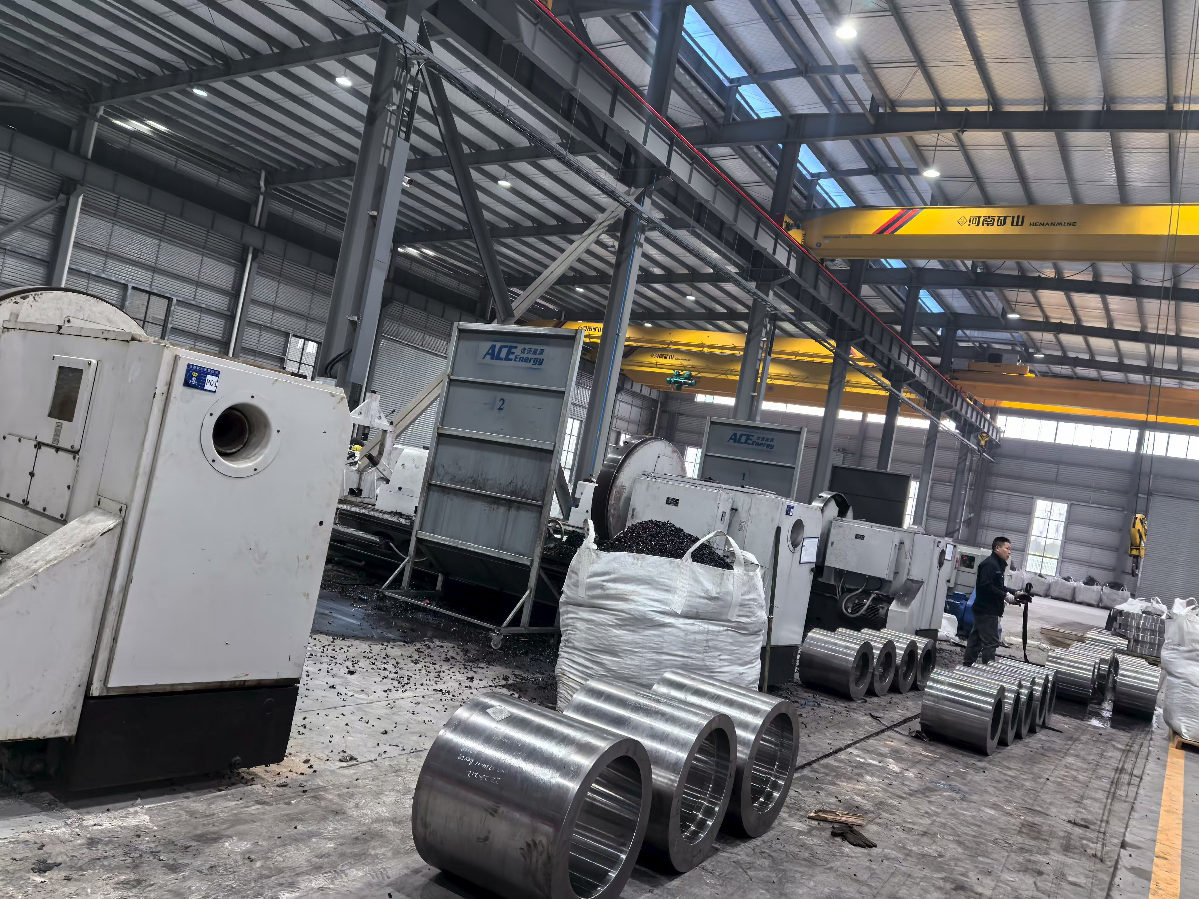 그룹의 주요이자 최대 규모의 생산 기지인 이 생산 기지는 ACE 그룹의 단조, 열처리 및 정밀 가공 생산량의 대부분이 생성되는 곳입니다. 시설 사진은 이 작업의 규모를 명확하게 보여줍니다. 여러 개의 오버헤드 브릿지 크레인을 갖춘 광대한 고천장 철 구조물 작업장, 무거운 원통형 부품을 처리하는 대형 CNC 머시닝 센터, 검사 및 발송 준비가 완료된 정밀 가공 부품의 깔끔하게 배열된 배치입니다. 작업장 바닥 레이아웃은 조직화된 흐름 관리를 반영합니다. 즉, 원자재와 가공 중인 자재는 완제품 구성품과 분리되고, 생산 구역은 린(Lean) 제조 원칙에 부합하는 바닥 표시로 구분됩니다.