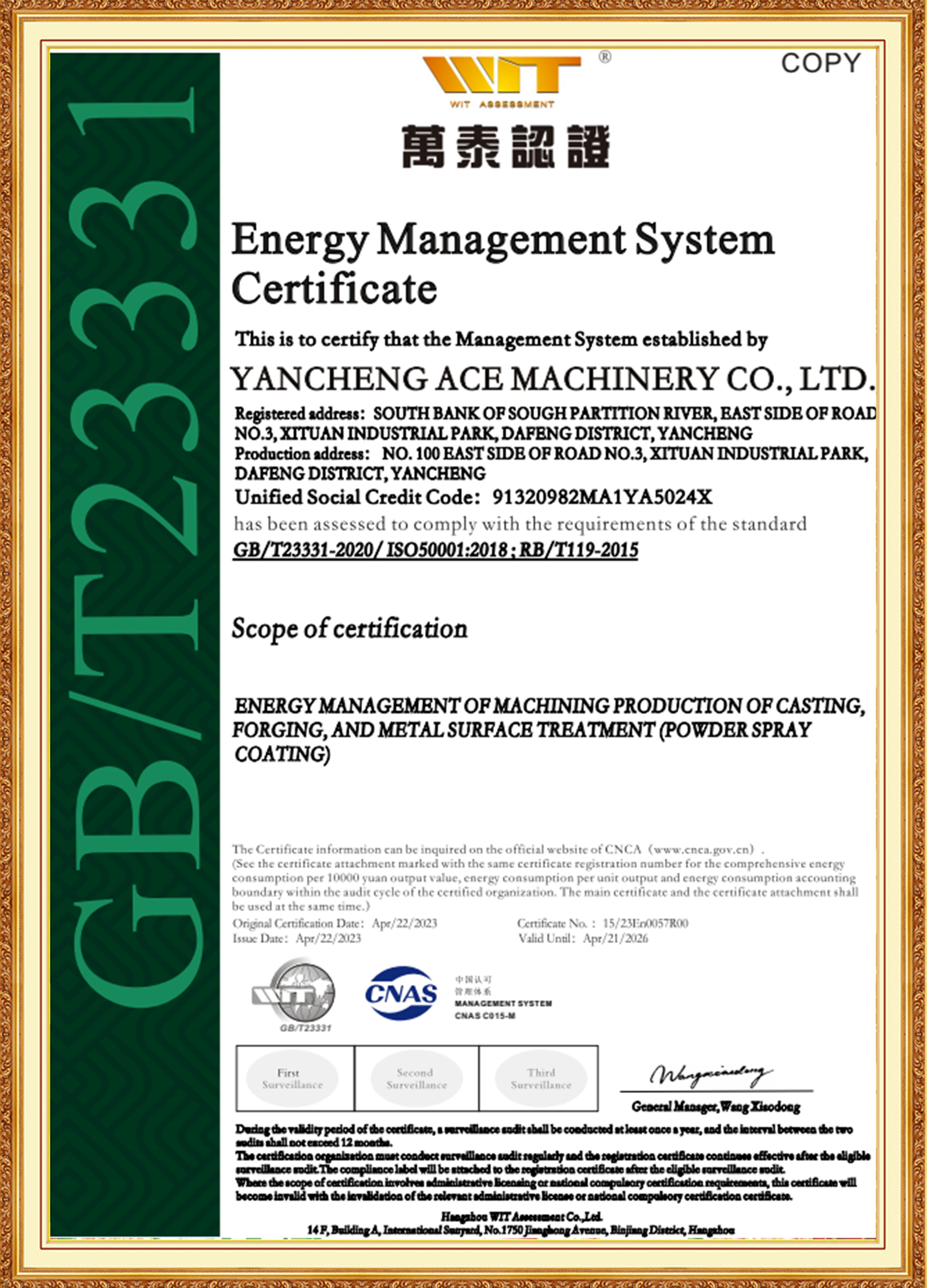 장쑤성 ACE 에너지 기술 유한 회사: 그룹의 핵심 생산 기지로 2025년 11월 공식적으로 운영을 시작합니다. 총 면적은 50,018m2를 초과하며 55에이커를 차지합니다. 공장에는 3톤, 5톤, 15톤 전기 유압식 해머가 장착되어 있습니다. 1미터 및 1.5미터 수직 링 롤링 기계; 에너지 효율적인 천연가스 가열로; 열처리 저항로; 담금질 탱크; 유도 경화 장비; 머시닝 센터; 그리고 다른 생산 장비.
